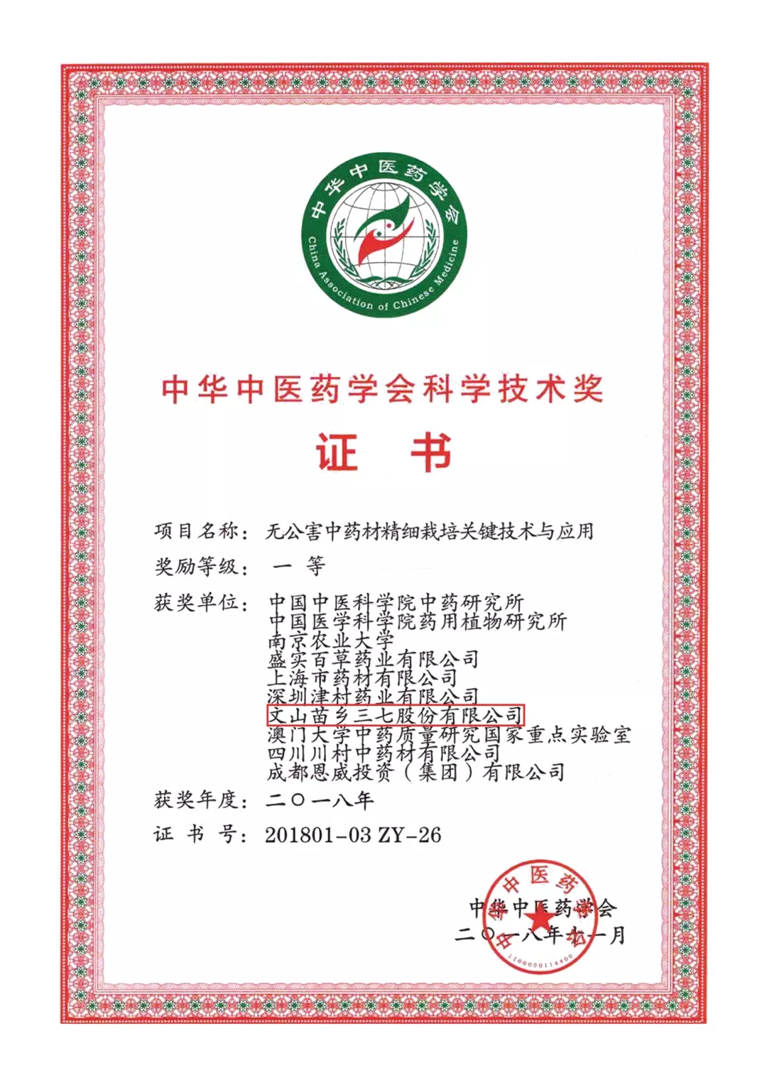苗鄉(xiāng)三七榮獲中華中醫(yī)藥學(xué)會科學(xué)技術(shù)一等獎