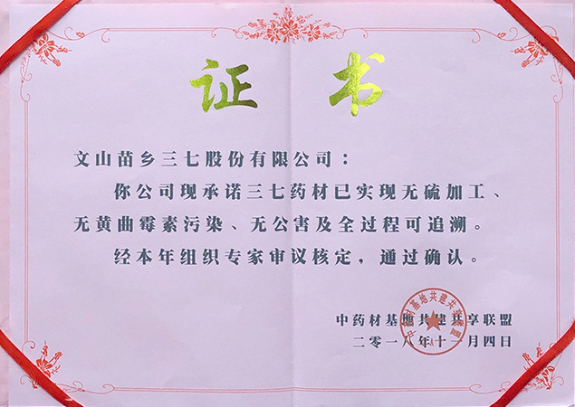 ? ? ? ?2018年11月3日,由中藥材基地共建共享聯(lián)盟主辦的第六屆中藥材基地共建共享聯(lián)盟交流大會于廣州舉辦,因苗鄉(xiāng)三七嚴(yán)格遵循無公害標(biāo)準(zhǔn),打造全產(chǎn)業(yè)鏈質(zhì)控及追溯體系,獲評為全國首批中藥材“三無一全”品牌基地,即無公害藥材生產(chǎn)、無硫加工、無黃曲霉素污染、全程可控可追溯,為三七品類的唯一獲評者。