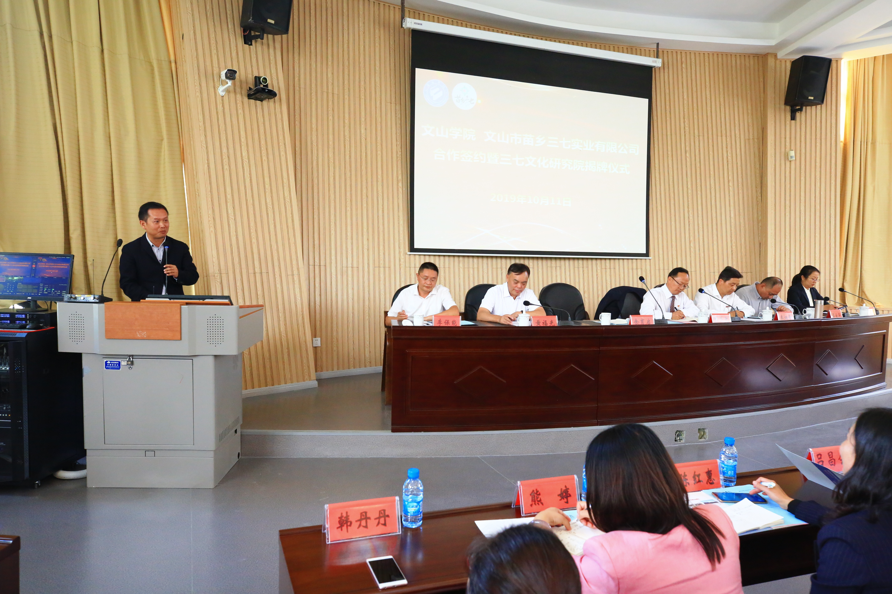 在文山學院學術(shù)交流中心報告廳,文山學院黨委書記熊榮元、文山學院院長李炳澤、文山州委宣傳部副部長廖云華、文山州教育體育局副局長黃福光、文山州三七和中醫(yī)藥產(chǎn)業(yè)發(fā)展中心主任李保能、苗鄉(xiāng)三七董事長余育啟等領(lǐng)導、文山學院師生代表、苗鄉(xiāng)三七員工代表等三百余人出席簽約揭牌儀式。