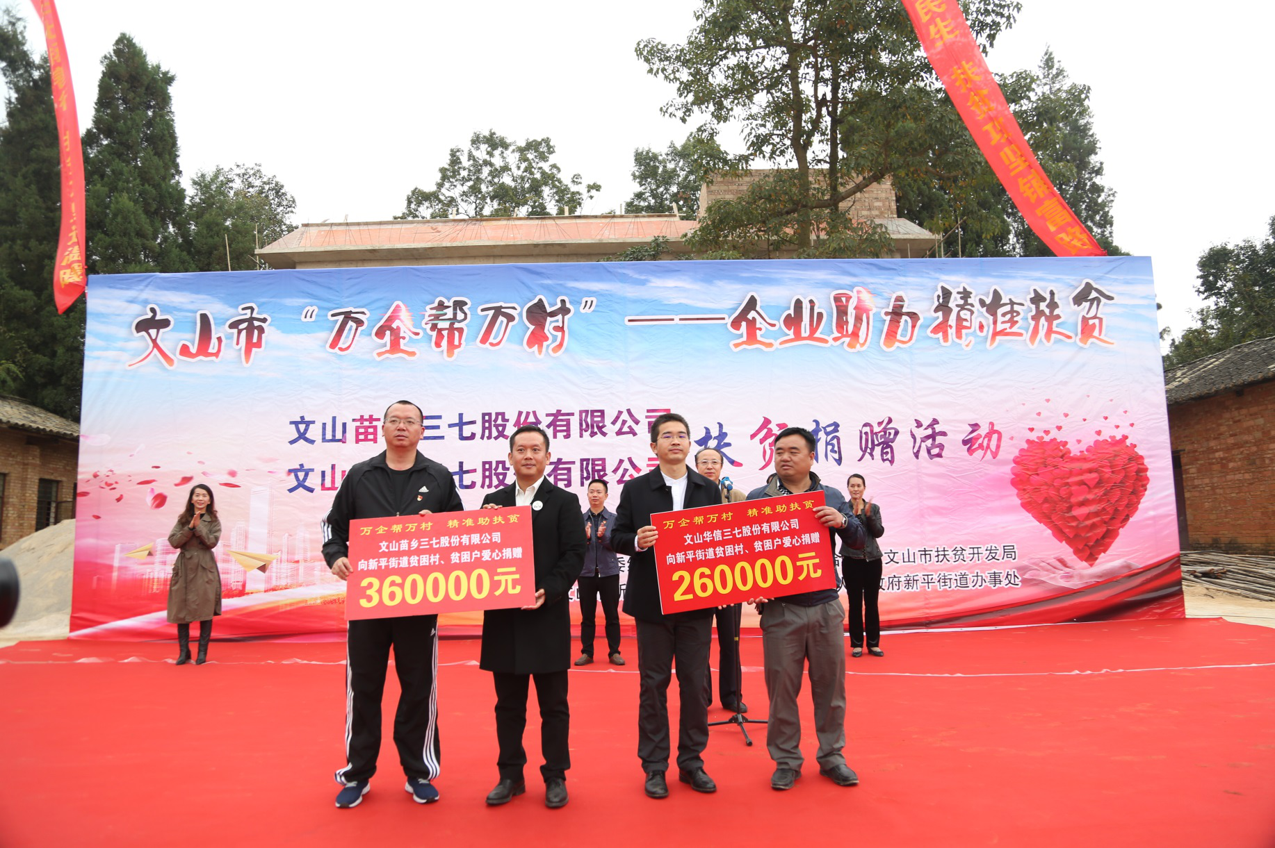 2017年11月18日,苗鄉(xiāng)三七董事長余育啟、副總經理田藝、董事長助理熊婷等代表苗鄉(xiāng)三七積極參與了文山市民營企業(yè)“萬企幫萬村”——精準扶貧活動,并向文山市新平街道迷灑社區(qū)新發(fā)寨村捐贈資金36萬元幫助進村道路建設及建檔立卡貧戶危房改造。精準扶貧作為各級黨委政府的核心工作之一,苗鄉(xiāng)三七作為產業(yè)化龍頭企業(yè),責無旁貸地積極參與其中履行社會責任,以實際行動投身精準扶貧,為建設和諧文山,打贏脫貧攻堅戰(zhàn)貢獻一份力量。