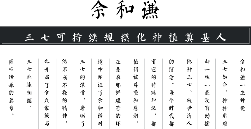 抗戰(zhàn)勝利,余和謙辭去飛虎隊后勤軍酒廠技術(shù)員服務(wù)員,到文山馬關(guān)農(nóng)場一個種三七的親戚家要了一衣兜紅籽(三七種子),回到喜古鄉(xiāng),開始在自家土地里種植三七。